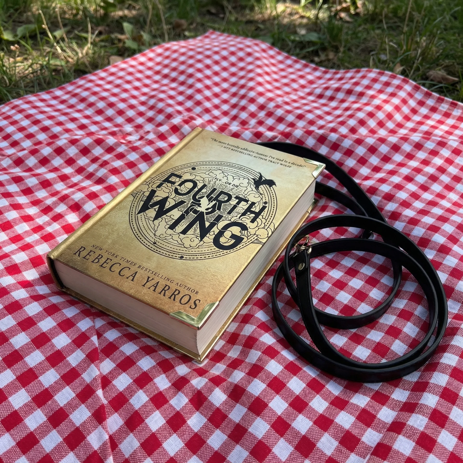 A stunning book-shaped bag featuring the iconic cover of Rebecca Yarros' Fourth Wing. Enter the world of Basgiath War College in style with this wearable work of art.